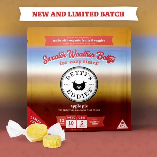 Sweater weather just got a whole lot cozier! Introducing Betty's limited batch apple pie fruit chews made with love, extra cinnamon, sugar, and CBG. Whether you're gearing up for the holidays or getting your winter hibernation on, Betty's newest fruit chew will be the ultimate companion for cozy vibes. Kick back, relax & let the warm & fuzzy feelings roll in - because taking it easy never tasted so 'snow' good!